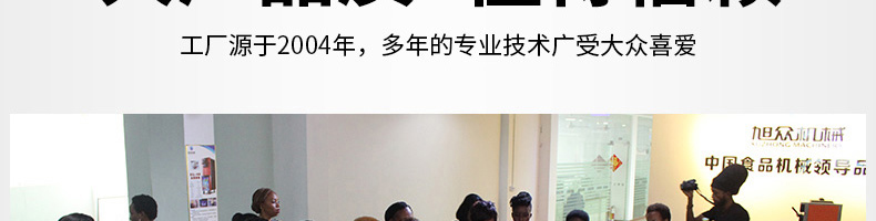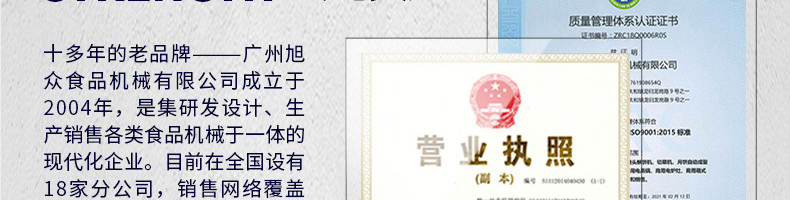 廣州旭眾食品機(jī)械有限公司是一家集科研開(kāi)發(fā),生產(chǎn)設(shè)計(jì),營(yíng)銷服務(wù)為一體的現(xiàn)代化生產(chǎn)企業(yè)。現(xiàn)代化生產(chǎn)車間,精湛制造技術(shù),所產(chǎn)機(jī)械歷經(jīng)市場(chǎng)重重考驗(yàn),不斷贏得海內(nèi)外客戶的贊譽(yù)。