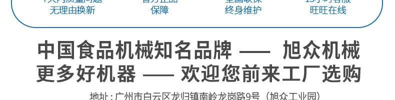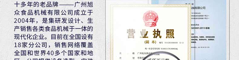 廣州旭眾食品機(jī)械有限公司是一家集科研開(kāi)發(fā),生產(chǎn)設(shè)計(jì),營(yíng)銷(xiāo)服務(wù)為一體的現(xiàn)代化生產(chǎn)企業(yè)。現(xiàn)代化生產(chǎn)車(chē)間,精湛制造技術(shù),所產(chǎn)機(jī)械歷經(jīng)市場(chǎng)重重考驗(yàn),不斷贏得海內(nèi)外客戶(hù)的贊譽(yù)。