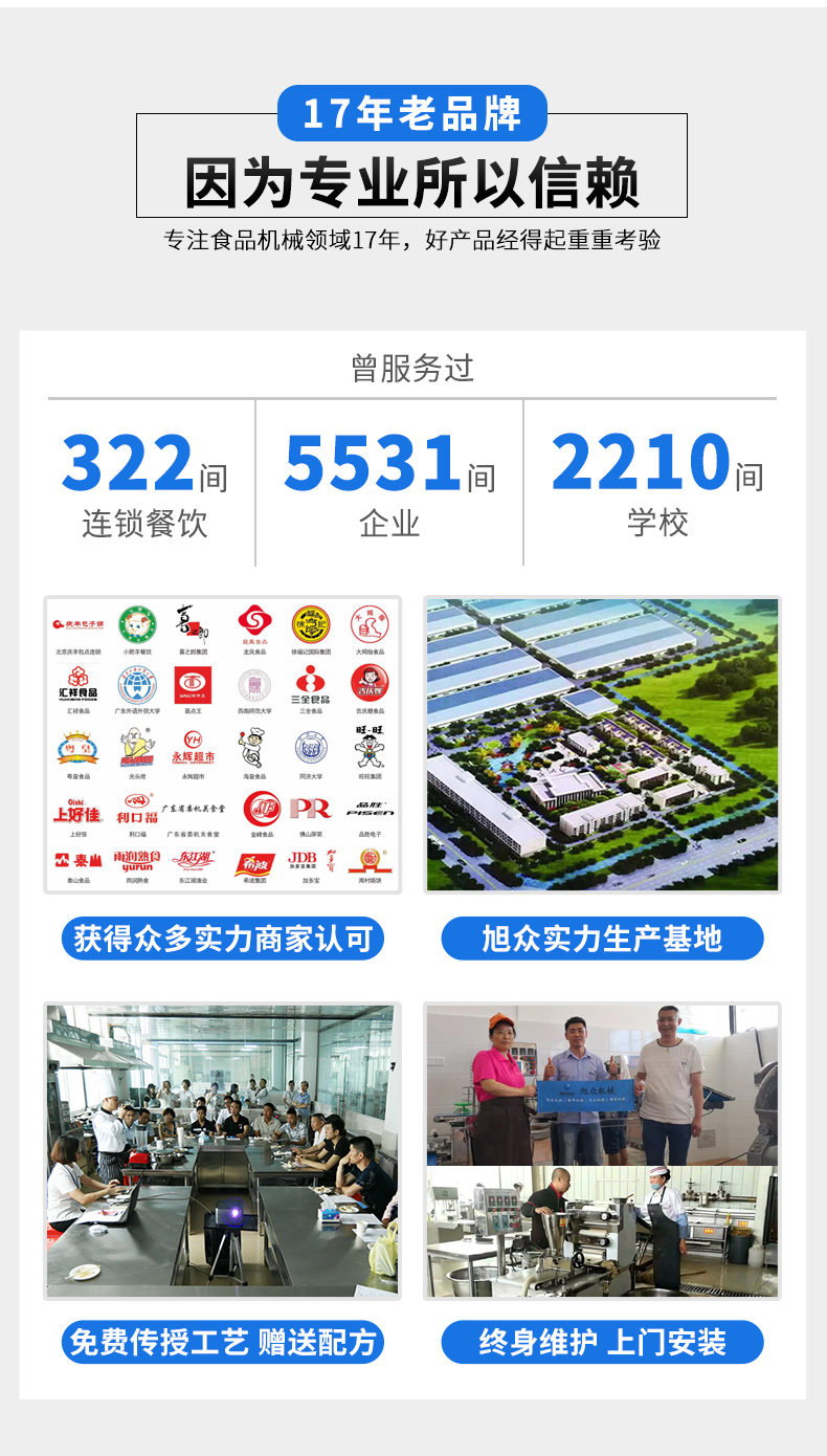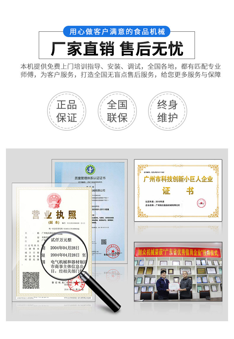 廣州旭眾食品機械有限公司是一家集科研開發(fā),生產(chǎn)設(shè)計,營銷服務(wù)為一體的現(xiàn)代化生產(chǎn)企業(yè)。現(xiàn)代化生產(chǎn)車間,精湛制造技術(shù),所產(chǎn)機械歷經(jīng)市場重重考驗,不斷贏得海內(nèi)外客戶的贊譽。