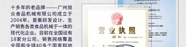 廣州旭眾食品機械有限公司是一家集科研開發(fā),生產(chǎn)設(shè)計,營銷服務(wù)為一體的現(xiàn)代化生產(chǎn)企業(yè)。現(xiàn)代化生產(chǎn)車間,精湛制造技術(shù),所產(chǎn)機械歷經(jīng)市場重重考驗,不斷贏得海內(nèi)外客戶的贊譽。