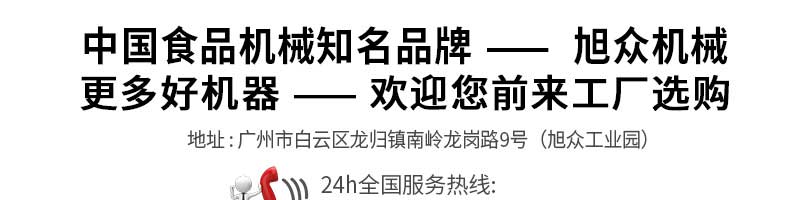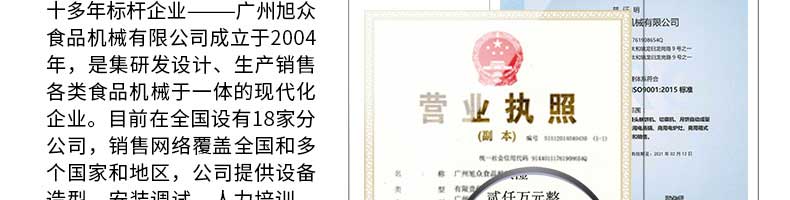 廣州旭眾食品機械有限公司是一家集科研開發(fā),生產(chǎn)設(shè)計,營銷服務(wù)為一體的現(xiàn)代化生產(chǎn)企業(yè)。現(xiàn)代化生產(chǎn)車間,精湛制造技術(shù),所產(chǎn)機械歷經(jīng)市場重重考驗,不斷贏得海內(nèi)外客戶的贊譽。