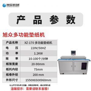 名稱XZ-170多功能墊紙機(jī) 電源220V/50Hz 功率1.2kw 產(chǎn)量10-100個(gè)/分鐘 尺寸1550*650*960mm 重量聯(lián)系銷售員 規(guī)格紙張寬20-90mm,內(nèi)徑75mm,外徑200mm 其他