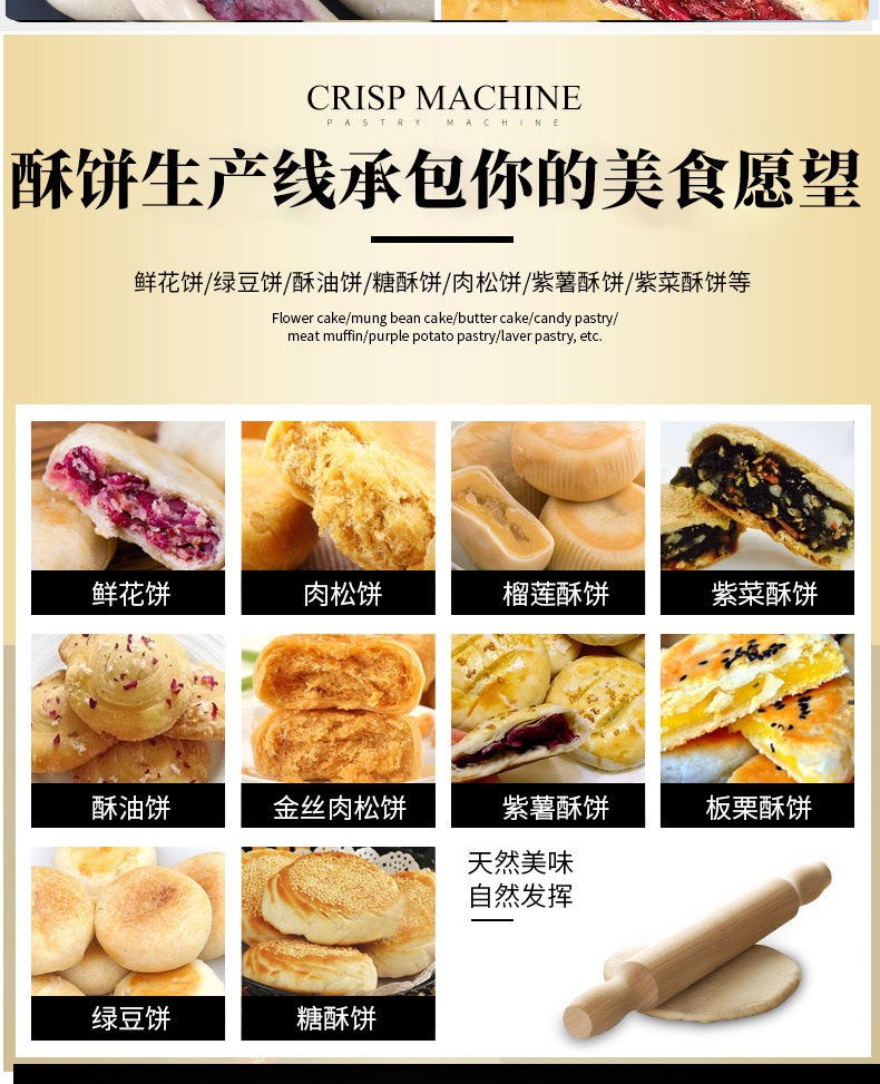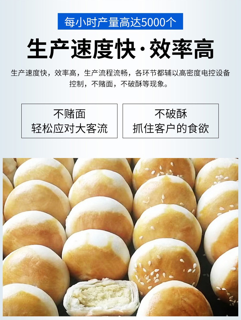 蛋黃酥生產(chǎn)線,酥餅生產(chǎn)線承包你的美食愿望。鮮花餅、綠豆餅、酥油餅、糖酥餅、肉松餅、紫薯酥餅、紫菜酥餅等。每小時產(chǎn)量高達(dá)5000個,生產(chǎn)速度快、效率高。