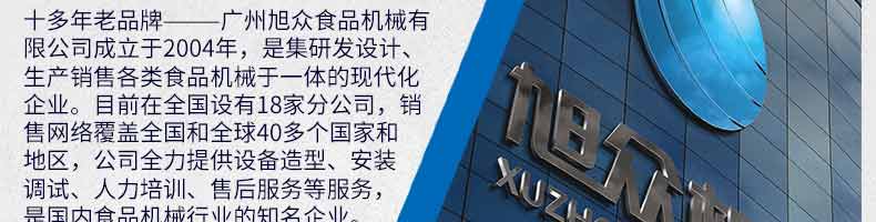 廣州旭眾食品機(jī)械有限公司是一家集科研開發(fā),生產(chǎn)設(shè)計(jì),營銷服務(wù)為一體的現(xiàn)代化生產(chǎn)企業(yè)。現(xiàn)代化生產(chǎn)車間,精湛制造技術(shù),所產(chǎn)機(jī)械歷經(jīng)市場(chǎng)重重考驗(yàn),不斷贏得海內(nèi)外客戶的贊譽(yù)。