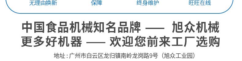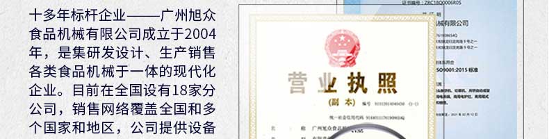 廣州旭眾食品機(jī)械有限公司是一家集科研開發(fā),生產(chǎn)設(shè)計(jì),營銷服務(wù)為一體的現(xiàn)代化生產(chǎn)企業(yè)?,F(xiàn)代化生產(chǎn)車間,精湛制造技術(shù),所產(chǎn)機(jī)械歷經(jīng)市場重重考驗(yàn),不斷贏得海內(nèi)外客戶的贊譽(yù)。