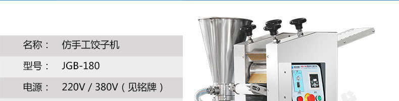JGB-180餃子機,先進的自動餃子生產(chǎn)設(shè)備,包括主動壓皮部分、自動供餡部分、自動包合部分、自動成品輸送部分,并且只要更換模具,就可制鍋貼等食品。適合食品速凍廠、飯店、廠礦學(xué)校食堂等制作包餡面制品單位使用。