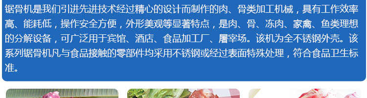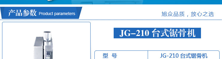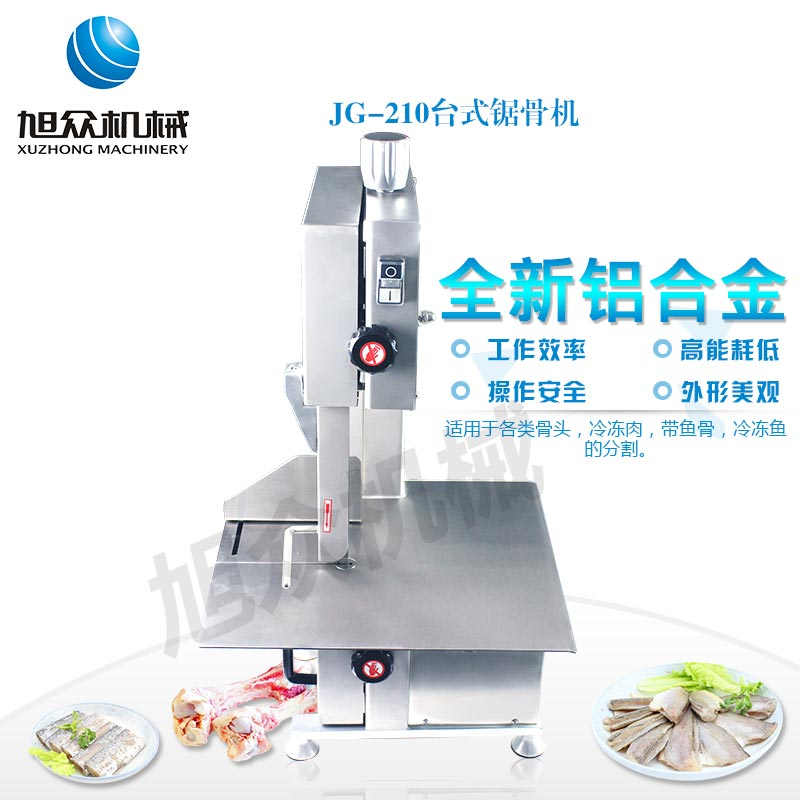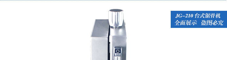JG-210臺式鋸骨機(jī),適用于各類骨頭,冷凍肉,帶魚骨,冰塊,冷凍魚的分割。采用全不銹鋼材料制作,具有工作效率高,操作安全的特點。廣泛適用于食品加工廠,屠宰場,肉類加工廠等