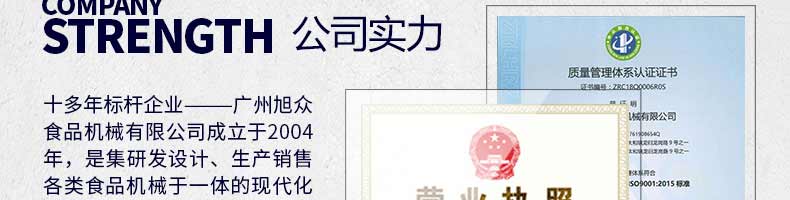 廣州旭眾食品機械有限公司是一家集科研開發(fā),生產(chǎn)設計,營銷服務為一體的現(xiàn)代化生產(chǎn)企業(yè)?,F(xiàn)代化生產(chǎn)車間,精湛制造技術,所產(chǎn)機械歷經(jīng)市場重重考驗,不斷贏得海內外客戶的贊譽。
