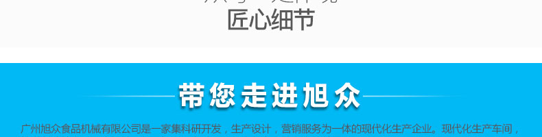 廣州旭眾食品機(jī)械有限公司是一家集科研開發(fā),生產(chǎn)設(shè)計(jì),營銷服務(wù)為一體的現(xiàn)代化生產(chǎn)企業(yè)?,F(xiàn)代化生產(chǎn)車間,精湛制造技術(shù),所產(chǎn)機(jī)械歷經(jīng)市場重重考驗(yàn),不斷贏得海內(nèi)外客戶的贊譽(yù)。