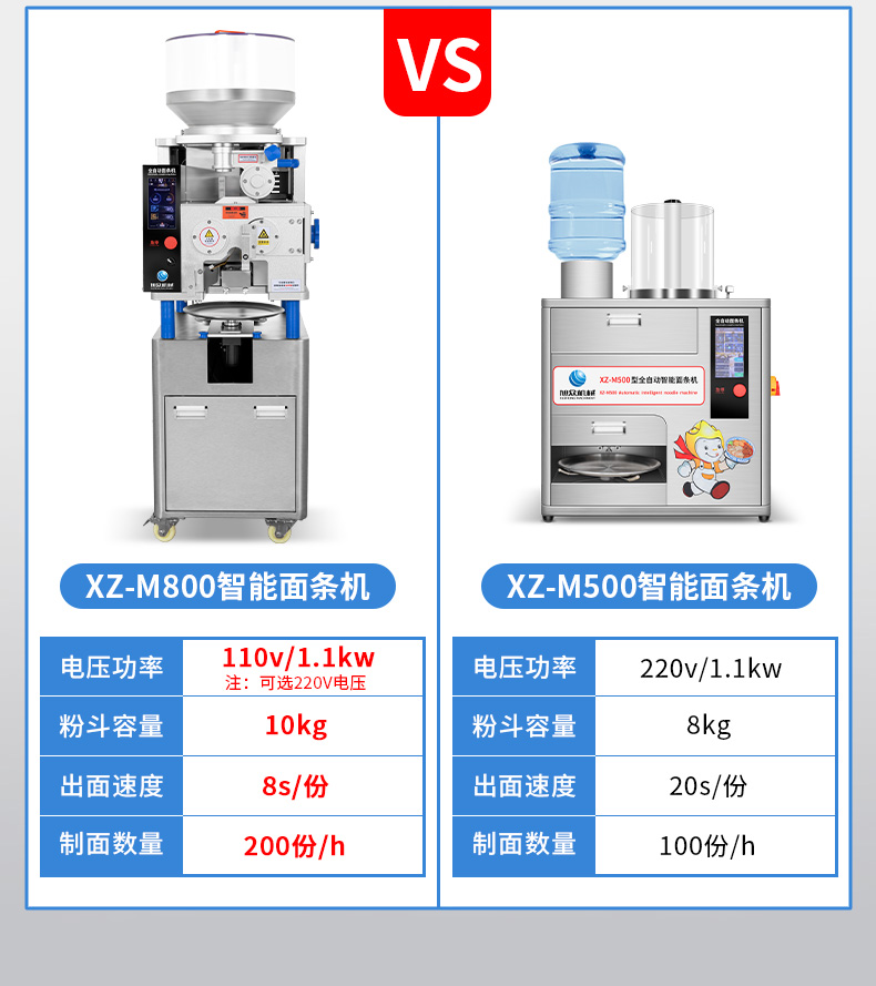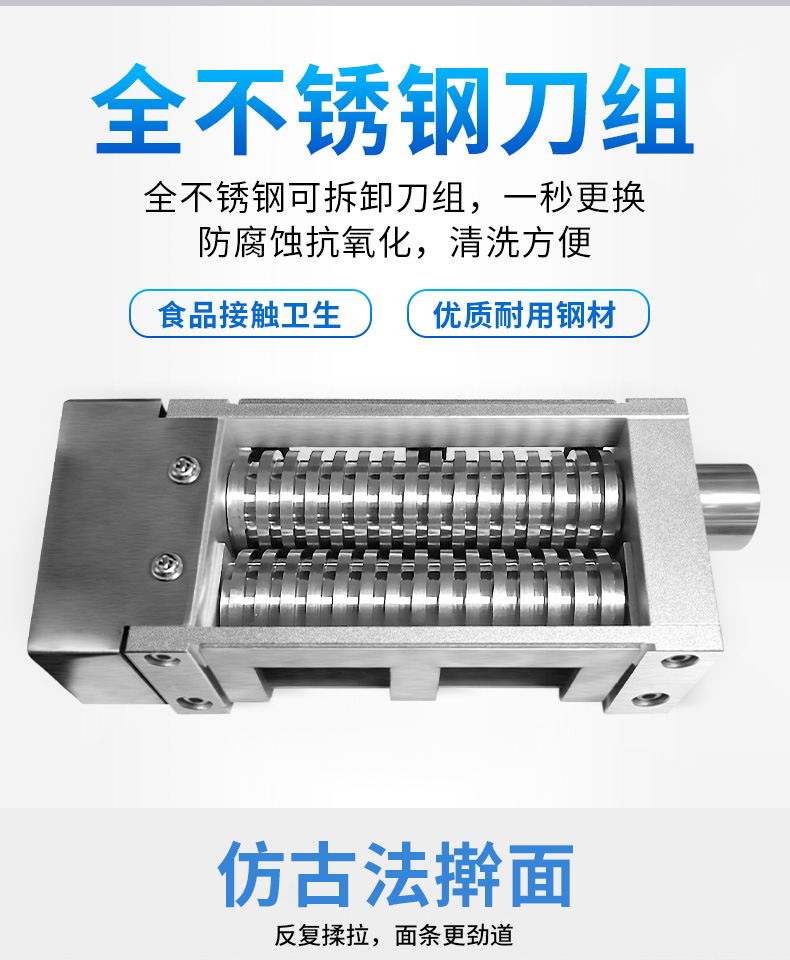 XZ-M800面條機(jī),制作多種面條:拉面、小面、牛肉面、韭葉面板面、褲帯面、蔬菜面、水果面、雜糧面8秒快速出面人性化設(shè)計(jì),更便捷更高效與同類(lèi)型機(jī)器相比,出面更快、秒換刀具。全不銹鋼刀組全不銹鋼可拆卸刀組,一秒更換防腐蝕抗氧化,清洗方便。