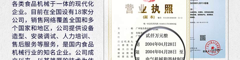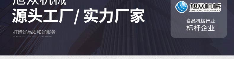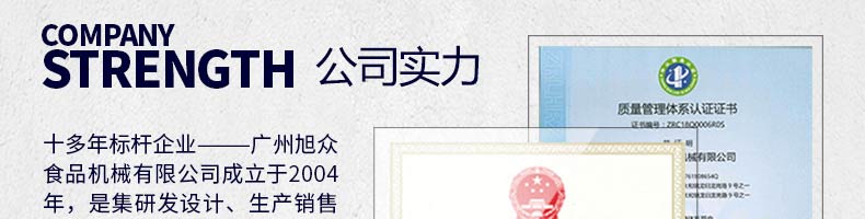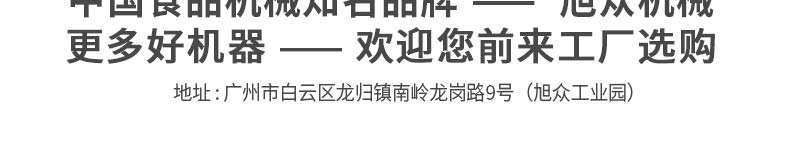 廣州旭眾食品機械有限公司是一家集科研開發(fā),生產(chǎn)設計,營銷服務為一體的現(xiàn)代化生產(chǎn)企業(yè)?,F(xiàn)代化生產(chǎn)車間,精湛制造技術(shù),所產(chǎn)機械歷經(jīng)市場重重考驗,不斷贏得海內(nèi)外客戶的贊譽。