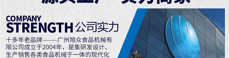 廣州旭眾食品機(jī)械有限公司是一家集科研開(kāi)發(fā),生產(chǎn)設(shè)計(jì),營(yíng)銷服務(wù)為一體的現(xiàn)代化生產(chǎn)企業(yè)?,F(xiàn)代化生產(chǎn)車間,精湛制造技術(shù),所產(chǎn)機(jī)械歷經(jīng)市場(chǎng)重重考驗(yàn),不斷贏得海內(nèi)外客戶的贊譽(yù)。