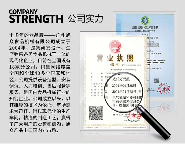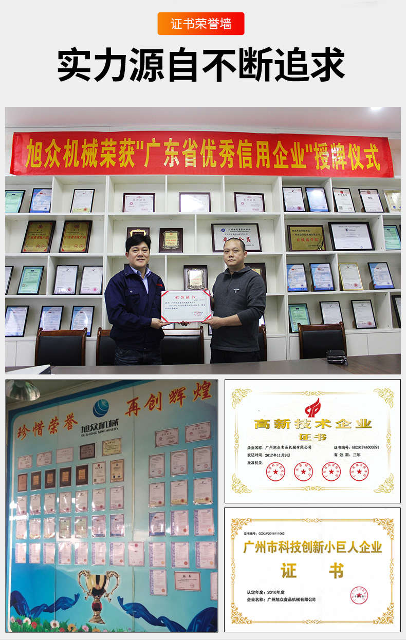 廣州旭眾食品機(jī)械有限公司是一家集科研開發(fā),生產(chǎn)設(shè)計(jì),營銷服務(wù)為一體的現(xiàn)代化生產(chǎn)企業(yè)?,F(xiàn)代化生產(chǎn)車間,精湛制造技術(shù),所產(chǎn)機(jī)械歷經(jīng)市場重重考驗(yàn),不斷贏得海內(nèi)外客戶的贊譽(yù)。