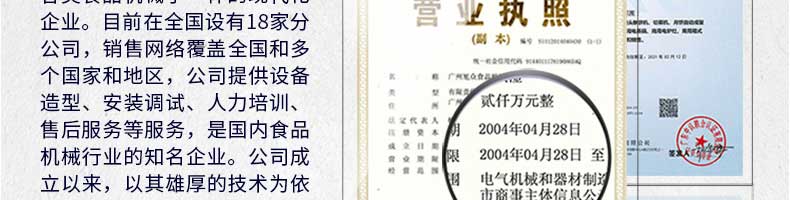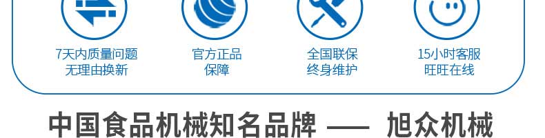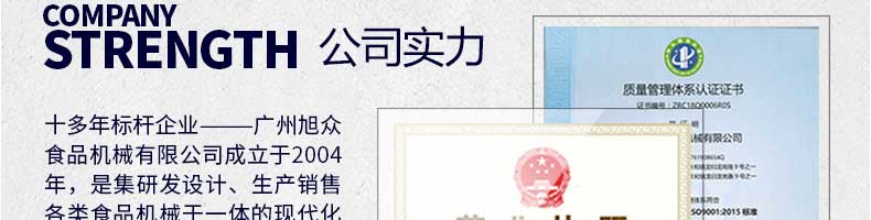 廣州旭眾食品機(jī)械有限公司是一家集科研開(kāi)發(fā),生產(chǎn)設(shè)計(jì),營(yíng)銷(xiāo)服務(wù)為一體的現(xiàn)代化生產(chǎn)企業(yè)?,F(xiàn)代化生產(chǎn)車(chē)間,精湛制造技術(shù),所產(chǎn)機(jī)械歷經(jīng)市場(chǎng)重重考驗(yàn),不斷贏得海內(nèi)外客戶的贊譽(yù)。