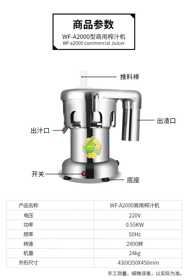 WF-A2000商用榨汁機(jī),該機(jī)所榨出的汁液是現(xiàn)榨的原汁,不含任何人為的防腐劑、穩(wěn)定劑、色素、香精、水等,凡與榨汁接觸的原件均為不銹鋼和無(wú)毒塑料聚丙烯和 A.B.S,食用安全。