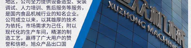 廣州旭眾食品機械有限公司是一家集科研開發(fā),生產(chǎn)設計,營銷服務為一體的現(xiàn)代化生產(chǎn)企業(yè)?,F(xiàn)代化生產(chǎn)車間,精湛制造技術(shù),所產(chǎn)機械歷經(jīng)市場重重考驗,不斷贏得海內(nèi)外客戶的贊譽。