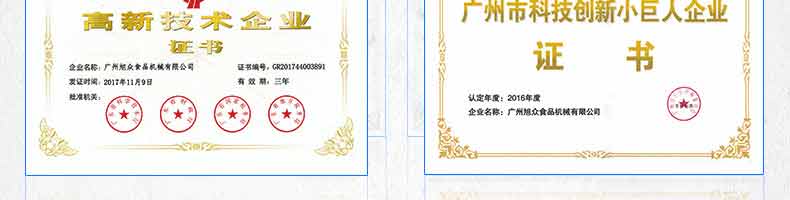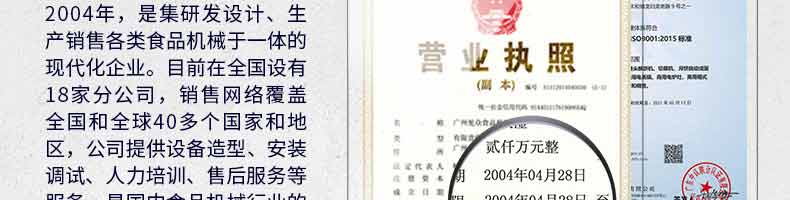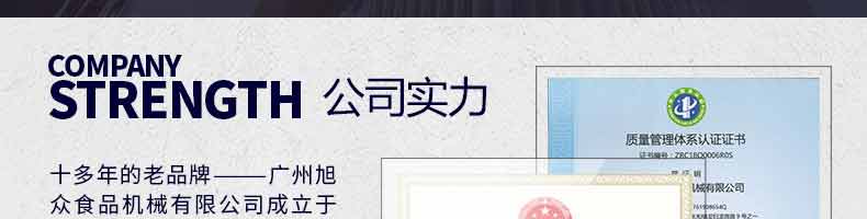 廣州旭眾食品機(jī)械有限公司是一家集科研開(kāi)發(fā),生產(chǎn)設(shè)計(jì),營(yíng)銷(xiāo)服務(wù)為一體的現(xiàn)代化生產(chǎn)企業(yè)?,F(xiàn)代化生產(chǎn)車(chē)間,精湛制造技術(shù),所產(chǎn)機(jī)械歷經(jīng)市場(chǎng)重重考驗(yàn),不斷贏得海內(nèi)外客戶的贊譽(yù)。