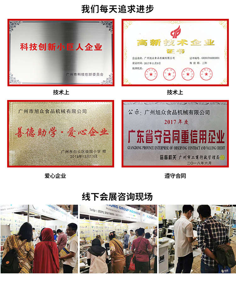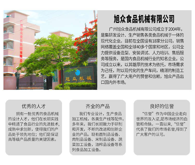 廣州旭眾食品機(jī)械有限公司是一家集科研開發(fā),生產(chǎn)設(shè)計,營銷服務(wù)為一體的現(xiàn)代化生產(chǎn)企業(yè)?,F(xiàn)代化生產(chǎn)車間,精湛制造技術(shù),所產(chǎn)機(jī)械歷經(jīng)市場重重考驗,不斷贏得海內(nèi)外客戶的贊譽。