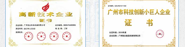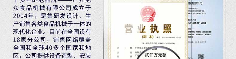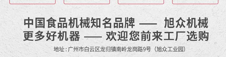 廣州旭眾食品機(jī)械有限公司是一家集科研開(kāi)發(fā),生產(chǎn)設(shè)計(jì),營(yíng)銷(xiāo)服務(wù)為一體的現(xiàn)代化生產(chǎn)企業(yè)?,F(xiàn)代化生產(chǎn)車(chē)間,精湛制造技術(shù),所產(chǎn)機(jī)械歷經(jīng)市場(chǎng)重重考驗(yàn),不斷贏得海內(nèi)外客戶的贊譽(yù)。