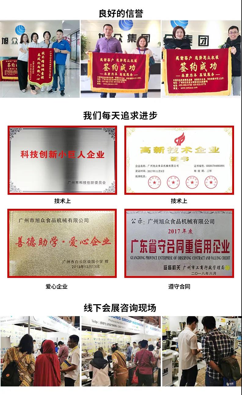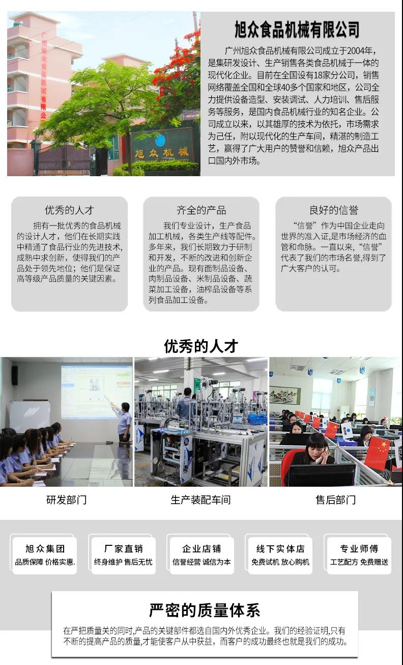 廣州旭眾食品機(jī)械有限公司是一家集科研開發(fā),生產(chǎn)設(shè)計(jì),營(yíng)銷服務(wù)為一體的現(xiàn)代化生產(chǎn)企業(yè)?,F(xiàn)代化生產(chǎn)車間,精湛制造技術(shù),所產(chǎn)機(jī)械歷經(jīng)市場(chǎng)重重考驗(yàn),不斷贏得海內(nèi)外客戶的贊譽(yù)。