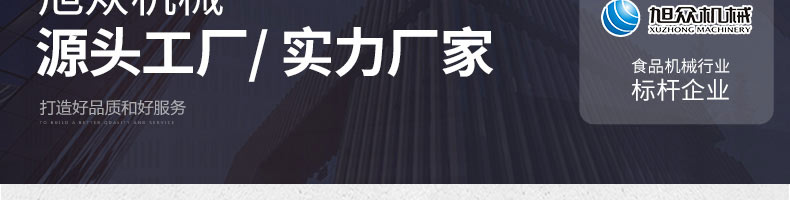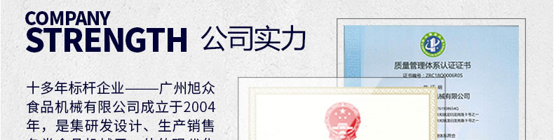 廣州旭眾食品機械有限公司是一家集科研開發(fā),生產(chǎn)設計,營銷服務為一體的現(xiàn)代化生產(chǎn)企業(yè)?,F(xiàn)代化生產(chǎn)車間,精湛制造技術(shù),所產(chǎn)機械歷經(jīng)市場重重考驗,不斷贏得海內(nèi)外客戶的贊譽。