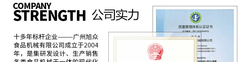 廣州旭眾食品機械有限公司是一家集科研開發(fā),生產(chǎn)設計,營銷服務為一體的現(xiàn)代化生產(chǎn)企業(yè)?,F(xiàn)代化生產(chǎn)車間,精湛制造技術,所產(chǎn)機械歷經(jīng)市場重重考驗,不斷贏得海內(nèi)外客戶的贊譽。