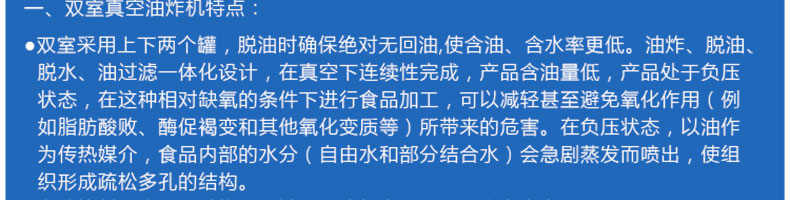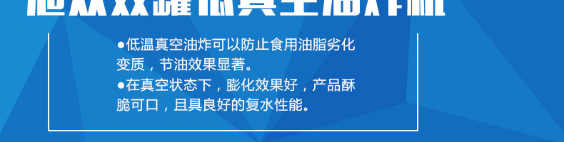 zk-700雙室低溫真空油炸機(jī),適用于水果類、蔬菜類、干果類、水產(chǎn)品機(jī)畜禽肉類等。自動控制溫度,無過熱、無過壓,確保產(chǎn)品質(zhì)量和安全生產(chǎn)。
