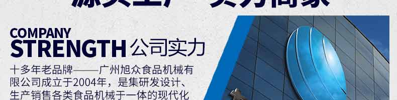 廣州旭眾食品機械有限公司是一家集科研開發(fā),生產(chǎn)設計,營銷服務為一體的現(xiàn)代化生產(chǎn)企業(yè)?,F(xiàn)代化生產(chǎn)車間,精湛制造技術,所產(chǎn)機械歷經(jīng)市場重重考驗,不斷贏得海內(nèi)外客戶的贊譽。